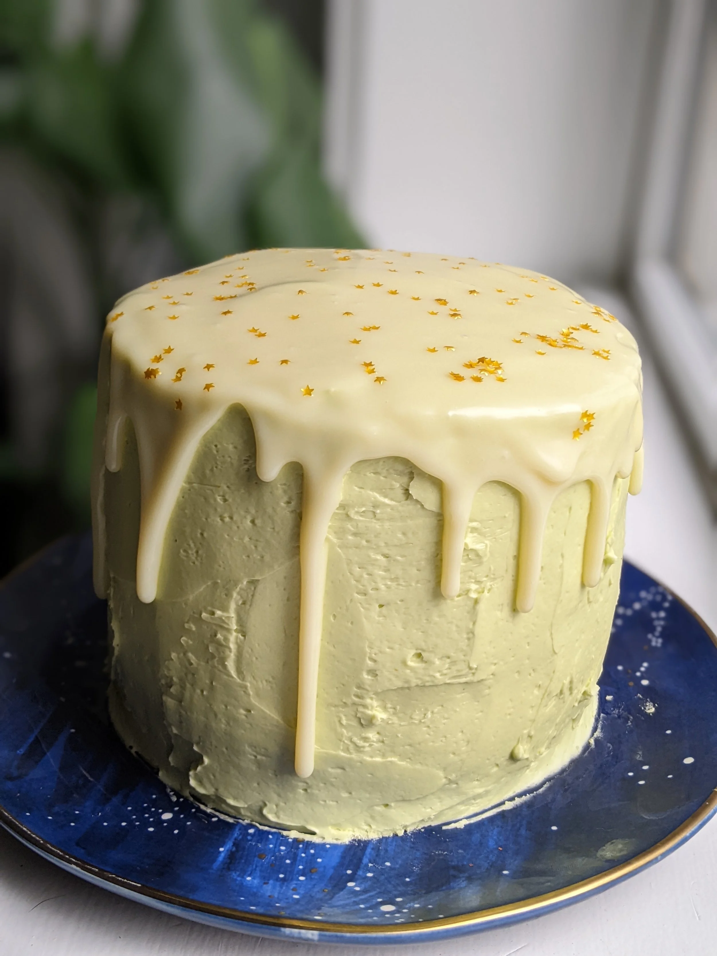 Vanilla Chocolate Chip Layer Cake with Passionfruit Frosting and White Chocolate Ganache Drip