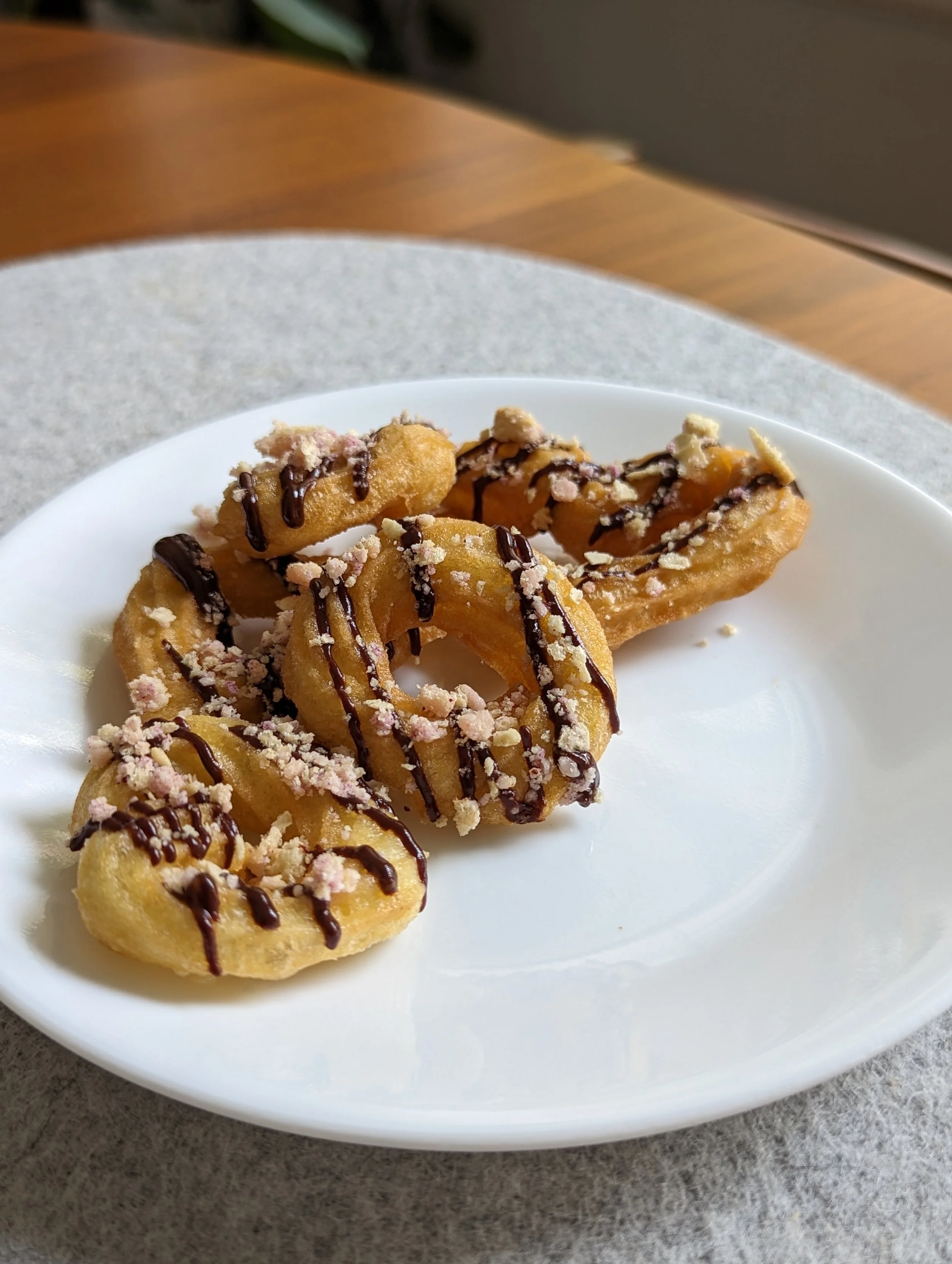 French Cruellers with Chocolate Drizzle and Strawberry Crumble