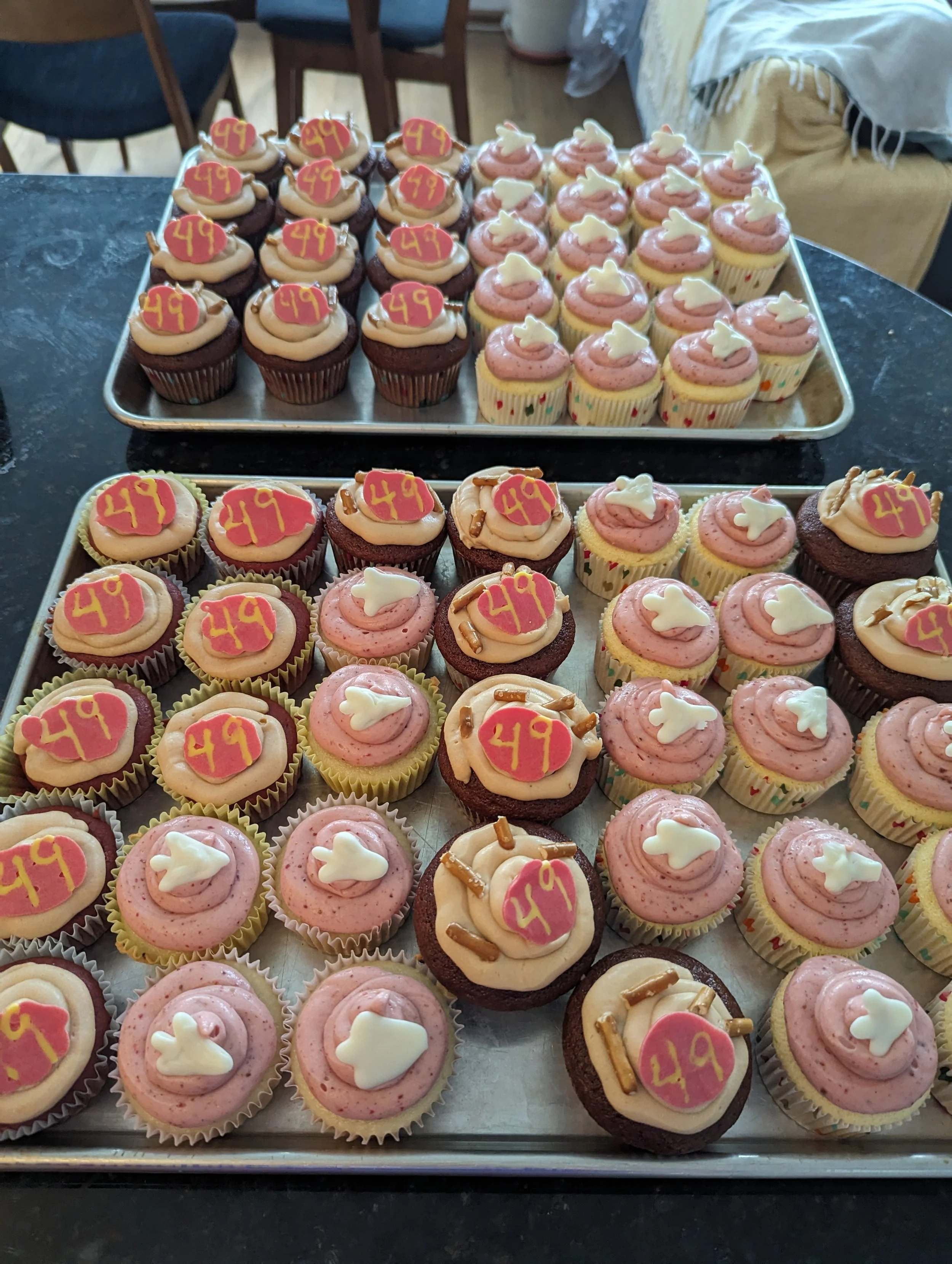 Red Velvet Cupcakes with Salted Caramel Frosting and Pretzels, Vanilla Chiffon Cupcakes with Strawberry Cream Cheese Frosting - for Superbowl 2024
